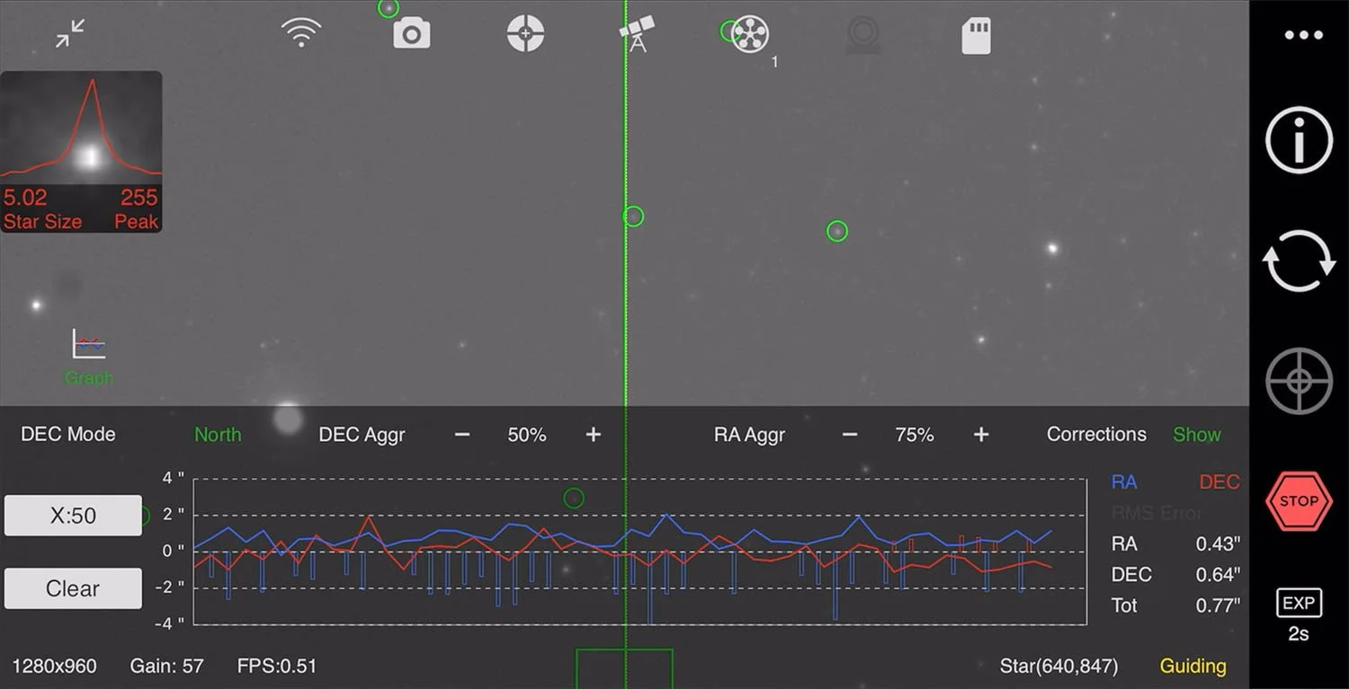 I don’t use the synscan app that pairs with this mount, I only run it off the ASIAir, which I also use to perform my polar alignments and go-tos. This mount is easy to align in this manner despite not having any form of polar finder or scope in its design. The go-tos or pointing are extremely accurate and meridian flips are trouble free. Everything has been all roses and candy so far in this review, so we are going discuss our challenges with this mount now. Autoguiding is where we will face our main problem. When you run calibration steps for this mount you will notice that on the RA axis everything goes perfectly smooth, but when you get to the Declination steps the mount has a lot of trouble stepping back to the original position, there is a gargantuan amount of backlash on this axis. I know many people have taken their’s apart in an attempt to improve this, but I am not confident that I would improve things much if I were to do that myself. Despite the backlash I get excellent guiding with this mount when conditions are favourable, meaning when there is low wind and the seeing is half decent. My total RMS error falls between 0.7 and 1.4 on average. I have seen it lower, and higher. Anything under 2 arc seconds on my setup gives me round stars on a 300 second guided exposure, so as long as it’s not too windy it gets the job done just fine. I can’t go any longer than that without issues, I’ve tried 7 and 10 minutes and never had it work, but sticking with 5 minutes gets me consistently good results.